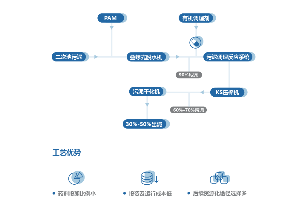 KS型压滤机+低温干化:耐高温高压,过滤压力大,滤板强度大,适用高温以各种物料分离。干化采用密闭低温干化,无粉尘飞灰,无需烟气回收系统。
